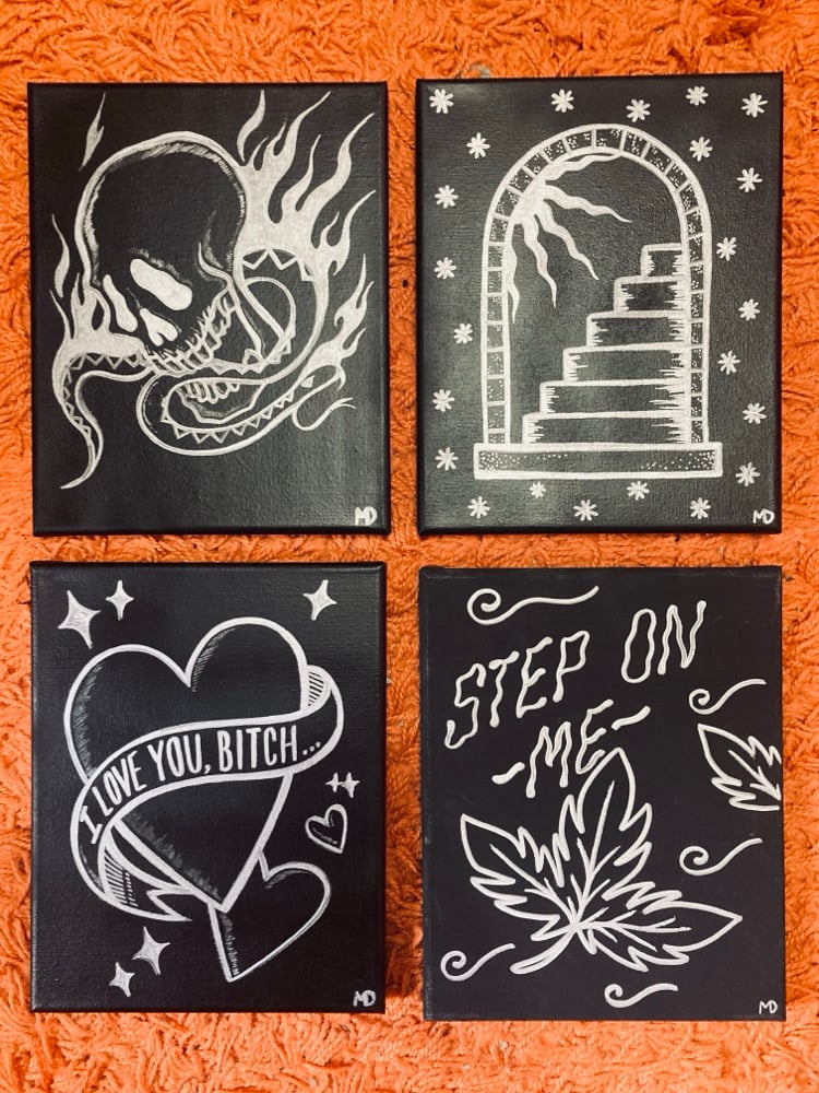 8" x 10" black canvases with silver hand-inked drawings. Each piece is one of a kind and lightweight, making them easy to hang or lean. Drawn in 2024 and signed. They are shipped within 3-5 business days of purchase.